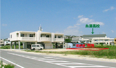 売地の奥に糸満高校が見えます。歩いて5分の場所にありますよ。 |