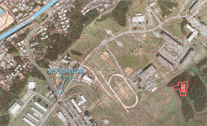 | 売り地の場所は、国道58号線、普天間飛行場ゲートの近くです。 |