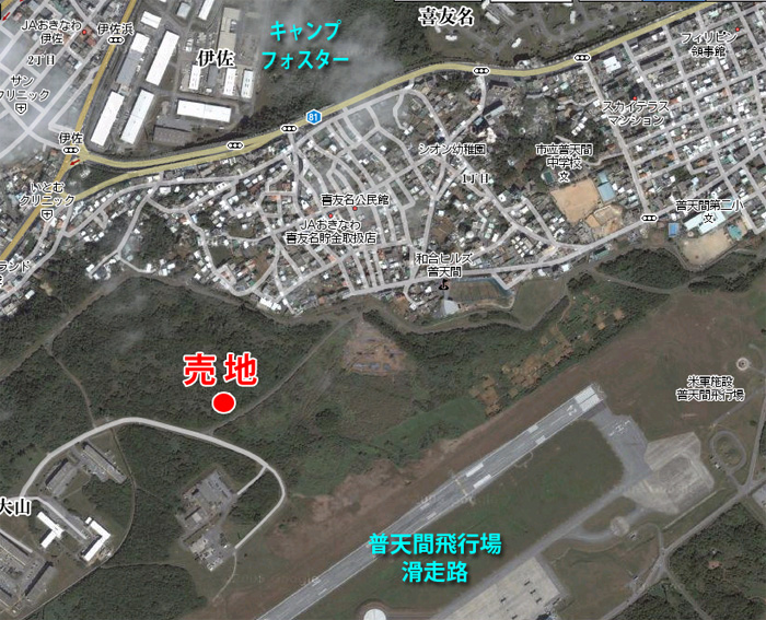 売地は、普天間飛行場の北側に位置しており、滑走路の左側です。また基地の外は、国道58号線(伊佐交差点)・普天間中学校・喜友名公民館 が近くにあります。